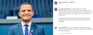 O deputado estadual Georgiano Neto -MDB usou assumiu publicamente a defesa do vereador Ismael Silva -PSD ao publicar texto de solidariedade em redes sociais. “Minha solidariedade ao vereador Ismael Silva, de Teresina, que tem sofrido ataques pessoais no plenário da Câmara Municipal incompatíveis com o ambiente democrático e de respeito que deve funcionar um parlamento. A divergência de pensamentos precisa ser conduzida com equilíbrio para o bom exercício da democracia em favor da população”, disse Georgiano.