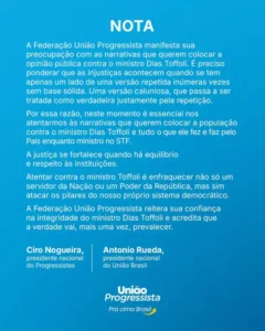 Mais cedo, a federação havia divulgado nota em que manifesta “confiança na integridade” do ministro e critica “narrativas” que estariam tentando desgastá-lo.